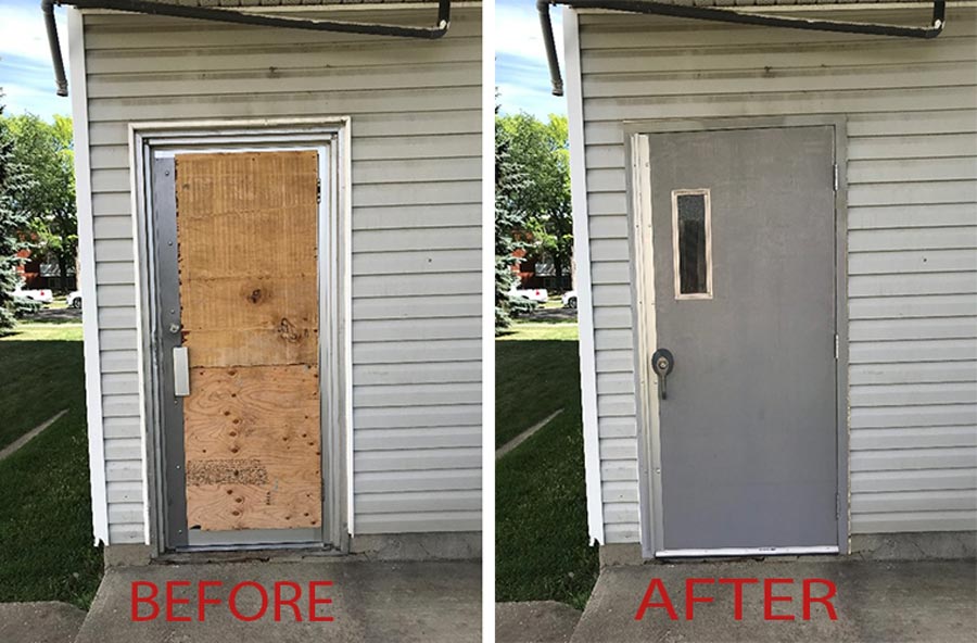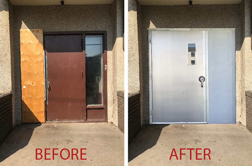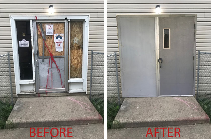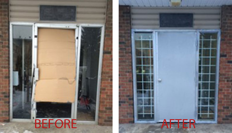 The door was originally breached through the side lite. We upgraded the entire unit with our Fortress Package, replacing the breakable glass side lite with reinforced steel and adding a GPW security window for visibility without compromising strength. We also enlarged the door opening to provide easier access and improved overall functionality.
