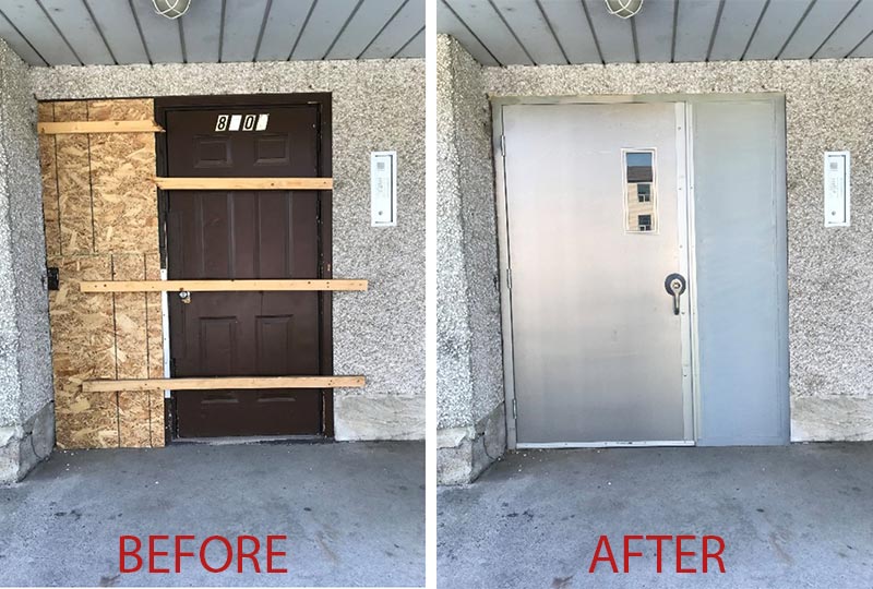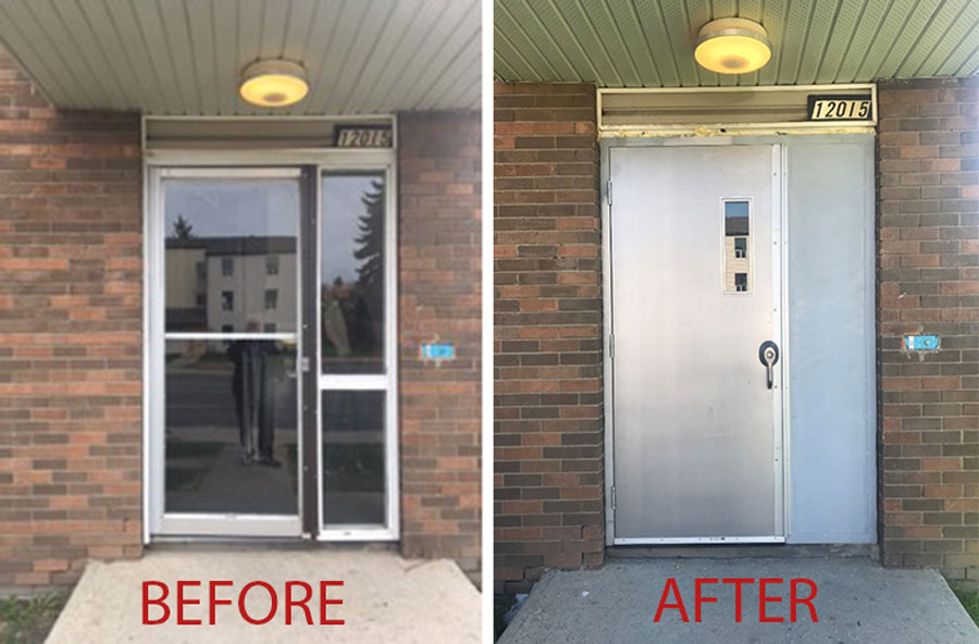 The door had become unstable and offered very little security. We upgraded it with our Fortress Package, replacing all glass on both the door and side lite with reinforced steel and adding a GPW security window for clear visibility. A full‑length astragal and a knob protector further strengthen the system, providing enhanced protection and lasting durability.